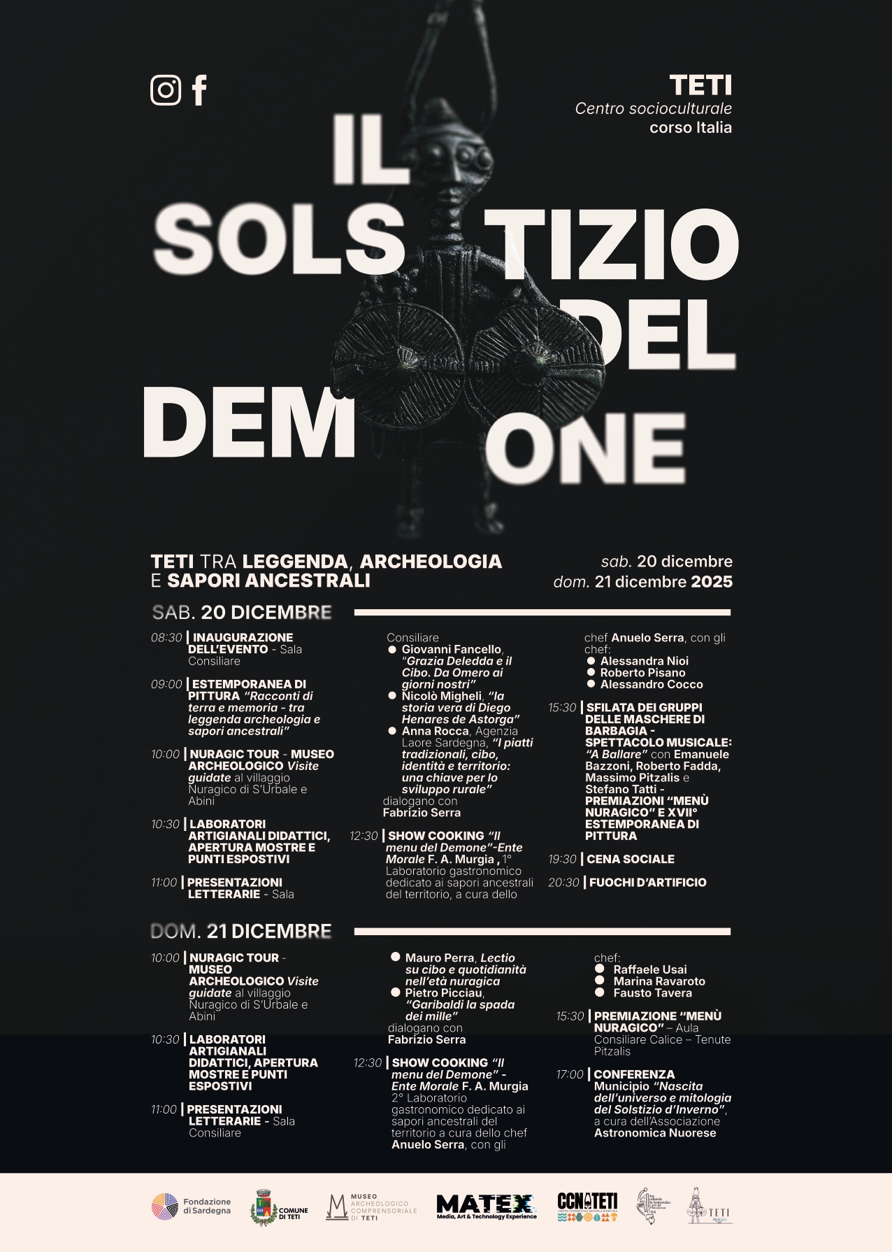 Nelle giornate di sabato 20 e domenica 21 dicembre, Teti ospita un percorso diffuso di mostre, laboratori, tour archeologici, spettacoli e attività culturali ispirate al mito del Demone di Teti, al Solstizio d’Inverno e al patrimonio storico-culturale locale.